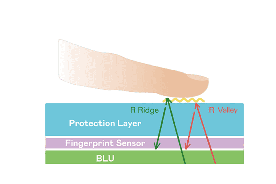 TFT 指纹扫描感测技术利用薄膜电晶体 (TFT) 当作光感测元件,,,,藉由非晶硅 (a-Si) 与低温多晶硅(LTPS)既有光电转换特性对不同波段光源进行吸收,,,,使感测 IC 读取阵列感测元件的光漏电差异,,,转换成数位灰阶影像。。。。